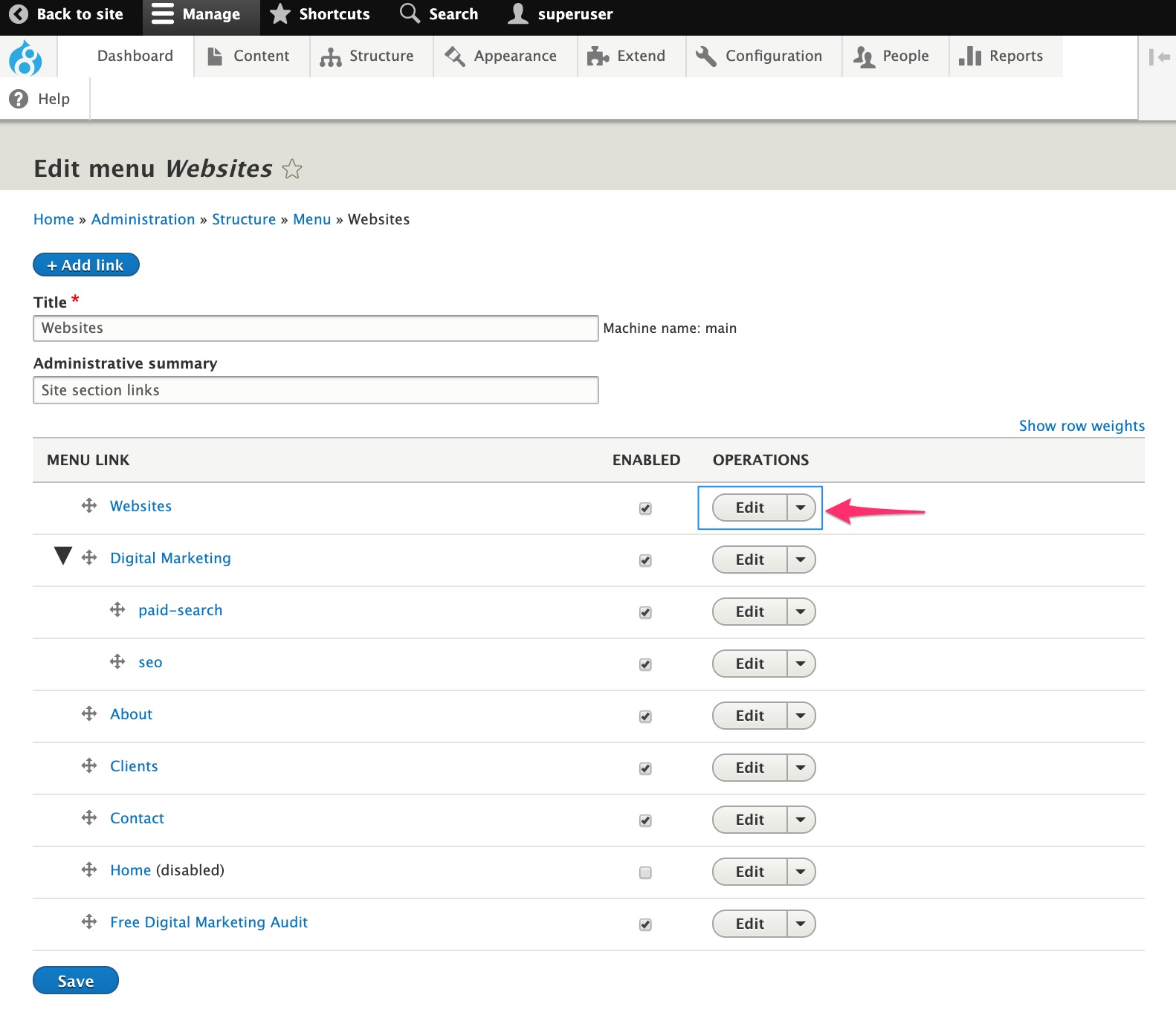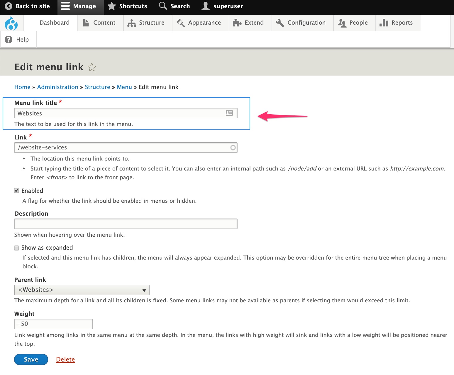 Change the Menu link title to the new name. Press Save at the bottom of the page.