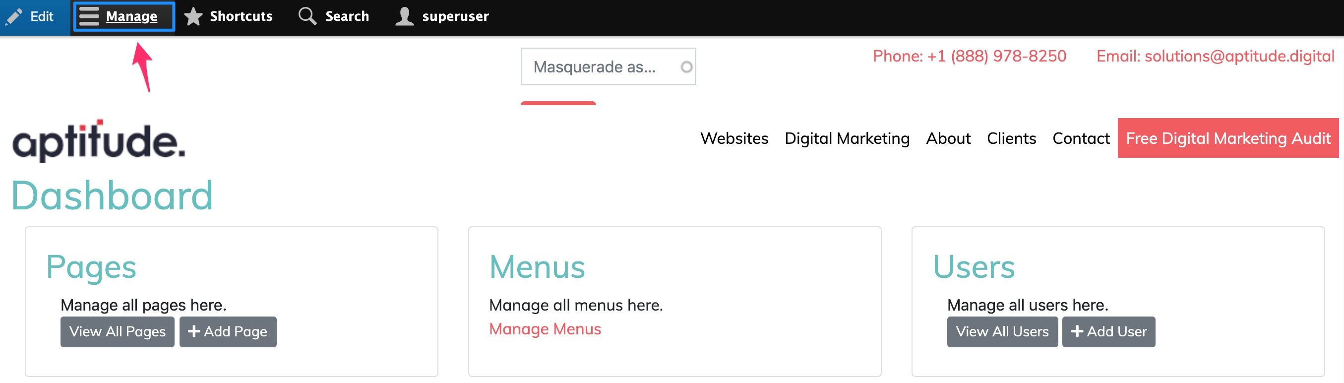 Manage content is the dashboard of the website. Each major component will be available for editing purposes.